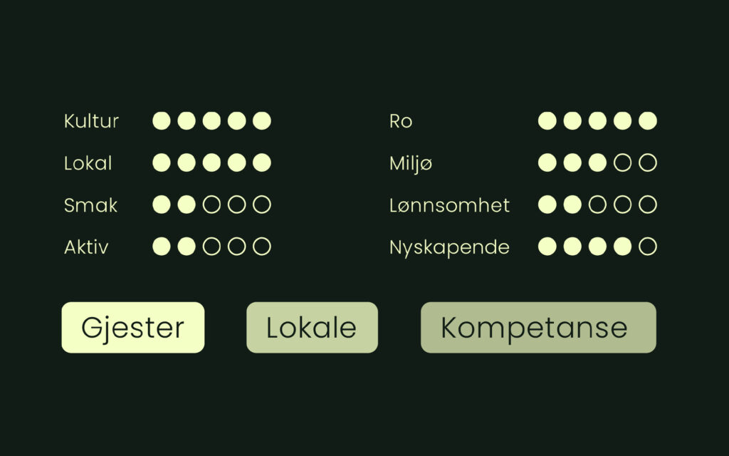 Teamet utviklet også et vurderingssystem basert på definerte kriterier, hvor konseptene ble evaluert opp mot ulike målgrupper: gjester, lokalbefolkning og relevante kompetansemiljøer.